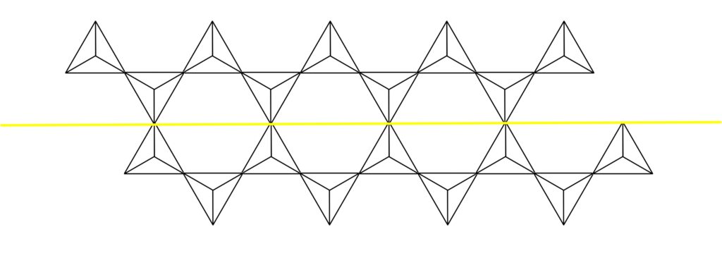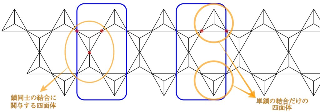 さらに、この1ユニット内の四面体を見てみると、単鎖を形成するだけの四面体が2つと鎖同士を繋いで二重鎖を形成している四面体が2つに分けられます。