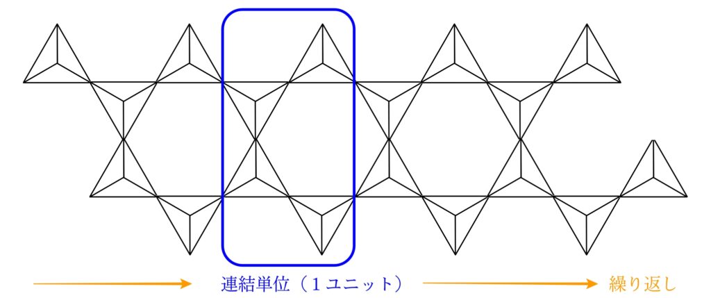 この構造を繰り返される最小単位で考えた場合、四面体4つで1ユニット(連結単位)と捉えることができます。