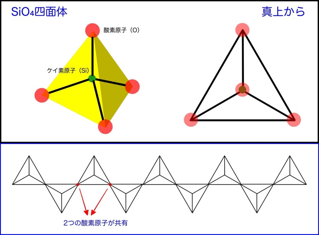 SiO₄四面体が持つ4つの酸素原子のうち、2つを隣りあう四面体と共有することで結合し、1本の鎖を形成していました。