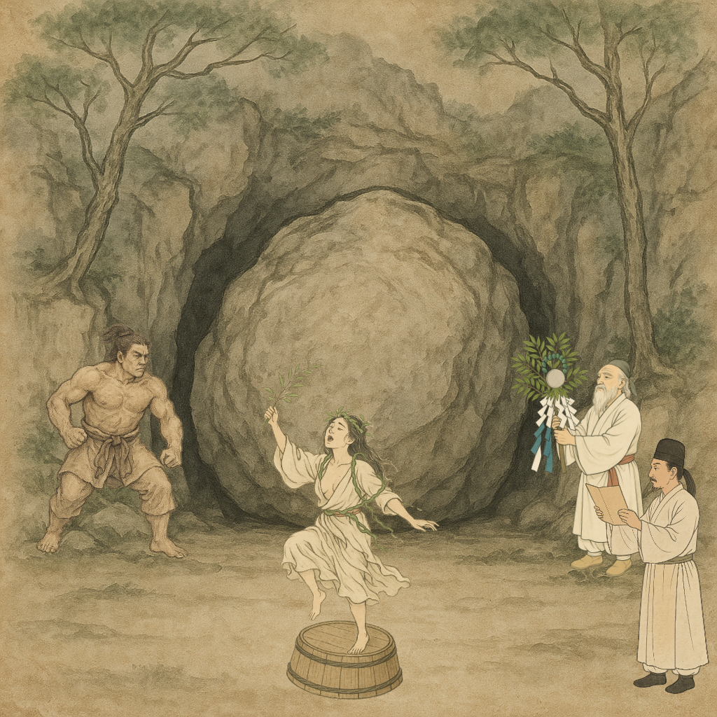 岩戸の脇に隠れて待ち構えていた天手力男神が、その隙を逃さず、力任せに岩戸の扉を開け放ちました。