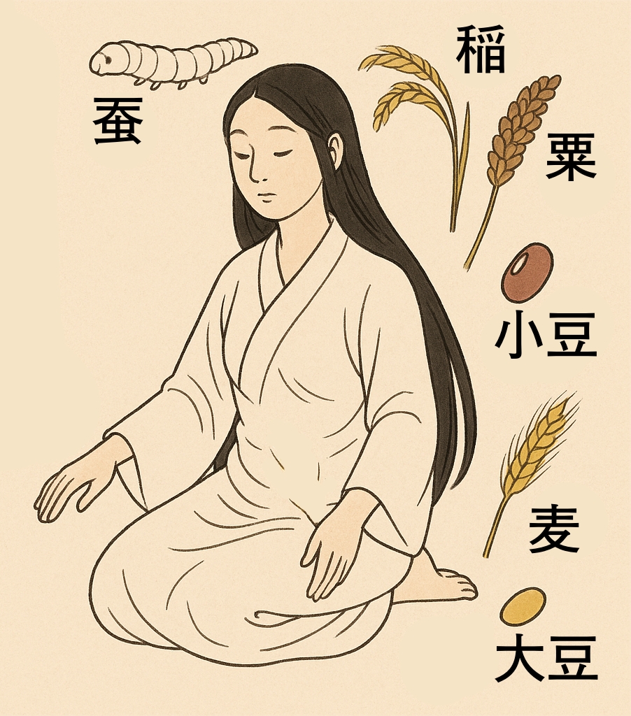 これらは神産巣日神(かみむすひのかみ)によってすべて集められ、穀物の種となりました。